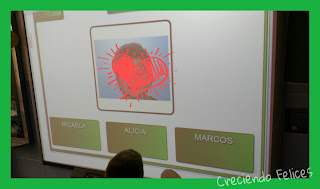 Esta actividad, la hicimos mucho el curso pasado. Ahora todos son capaces de identificar su nombre, pero los primeros días volvimos a practicarla porque les encanta, y añadimos la variante de adivinar el nombre del resto de los compañer@s. Está diseñada con el software de la PDI (SMART NOTEBOOK 10). En el recuadro central, van pasando todas las fotos muy deprisa. Lo tocas y se para en una imagen, con tres alternativas de nombres a elegir y sólo uno correcto. A continuación, vuelven a pasar nuevamente las imágenes y se para en una diferente, sin repetir en ninguna ocasión hasta que han aparecido todas las fotos.